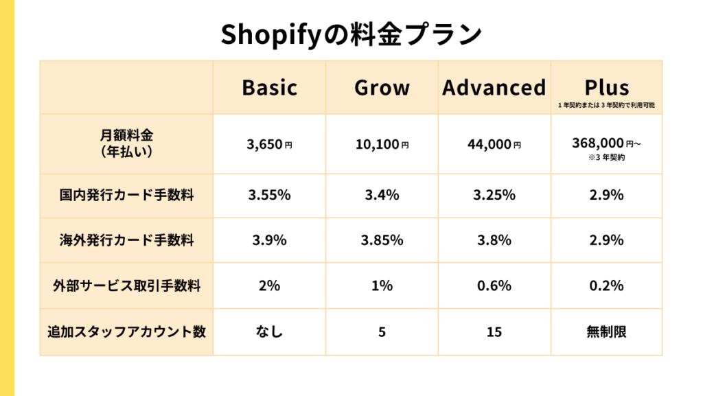 Shopifyには大きく分けて4つの料金プランがあります。Basic、Grow、Advancedの最初の3か月間は月額150円で利用でき、年払いだと最大25%割引になります。
