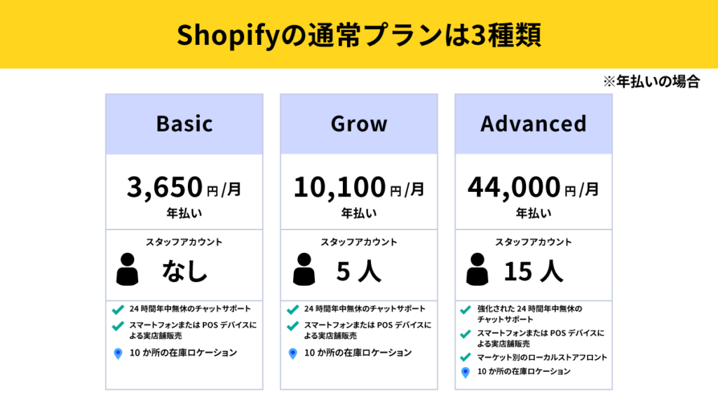 Shopifyの通常プランは、ベーシック、スタンダード、プレミアムの3種類です。年払いだと料金が25%お得になります。